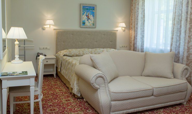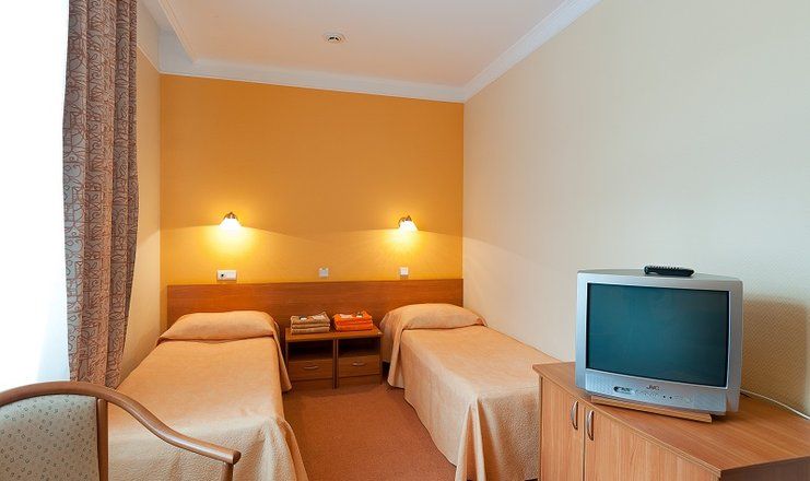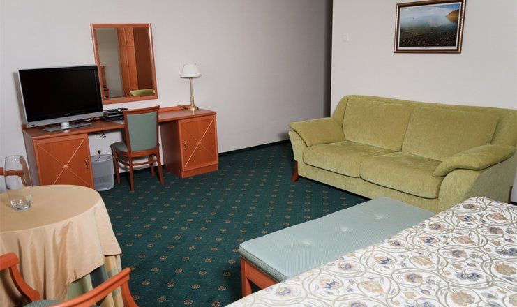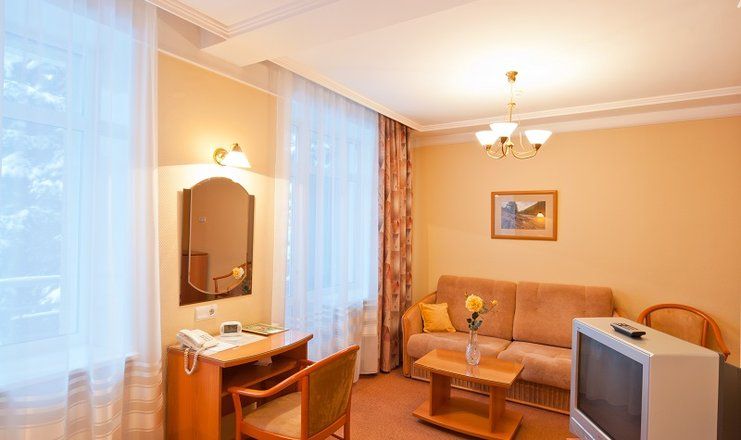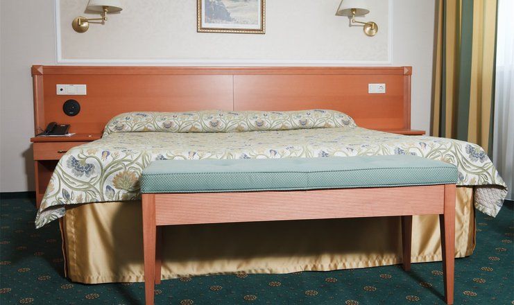 Оснащение номера: две односпальные кровати или одна двуспальная, прикроватные тумбочки, письменный стол, шкаф, два кресла, стул, столик журнальный, телевизор, чайник, мини-бар, телефон