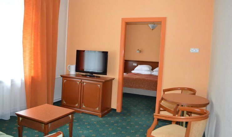Оснащение номера: спальня и гостиная, двуспальная кровать , прикроватные тумбы, стол, шкаф, набор мягкой мебели, стулья, столик журнальный, телевизор, чайник, мини-бар, телефон
