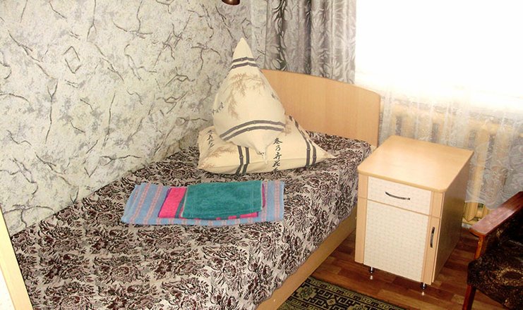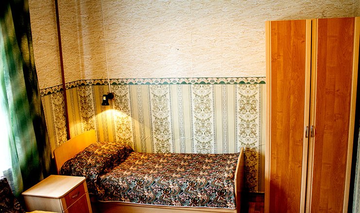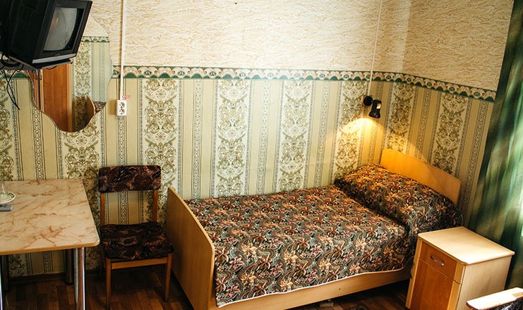 Оснащение номера: односпальная кровать, прикроватная тумбочка, стол, стул, шкаф, зеркало, телевизор, утюг, электрочайник, холодильник (в холле)