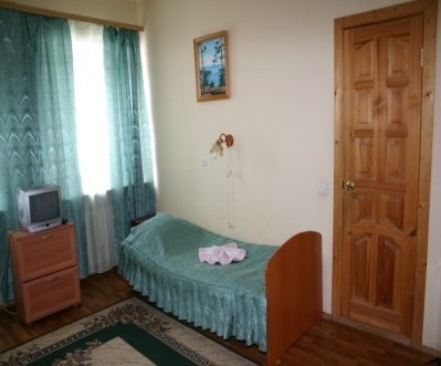 В номере: односпальная кровать, прикроватная тумбочка, телевизор, шкаф.