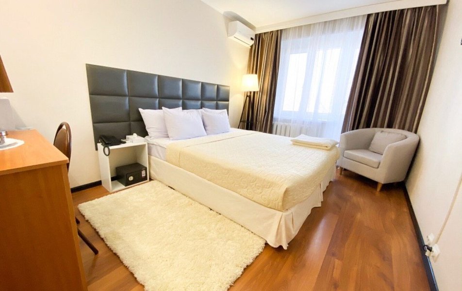 В номере: кухня, диван раскладной, кровать двуспальная, прикроватные тумбочки, стол, столик журнальный, стулья, шкаф, гладильная доска, кондиционер, микроволновая печь, набор посуды, плита электрическая, посудомоечная машина, телевизор, телефон, утюг, холодильник, электрочайник