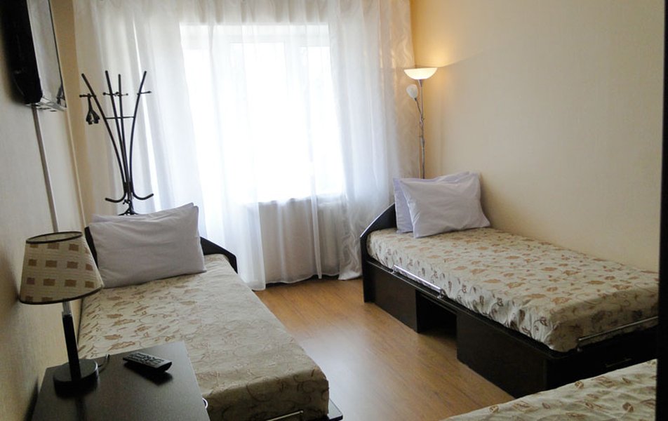 В номере: кровати односпальные: 3 шт., прикроватные тумбочки, стол, стул, шкаф, телевизор, телефон, холодильник, чайный набор посуды, электрочайник