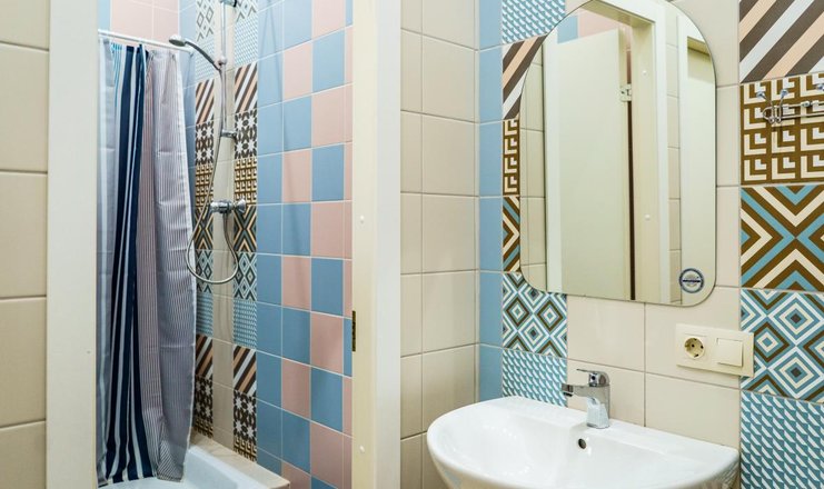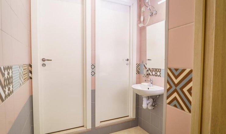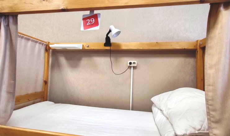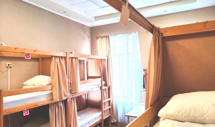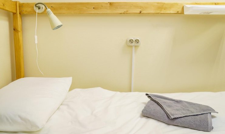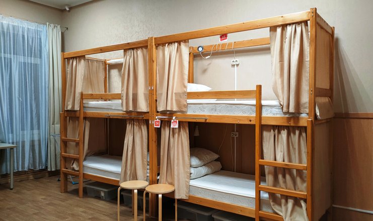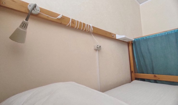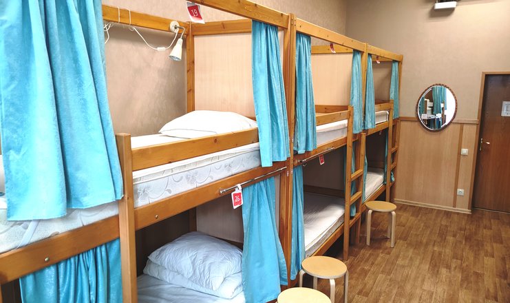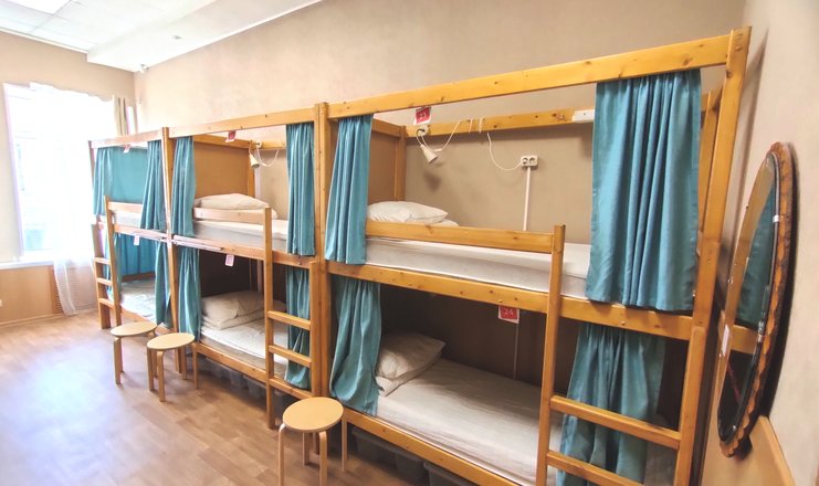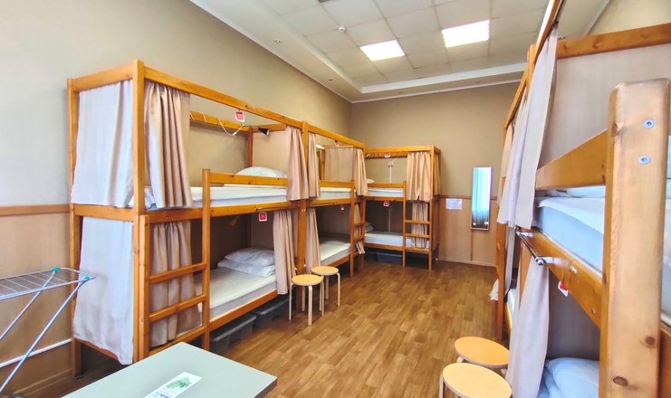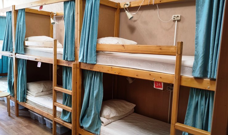 В номере: кровати двухъярусные, вешалка, зеркало, стол, табуреты, кондиционер