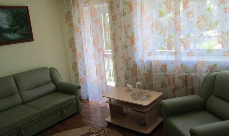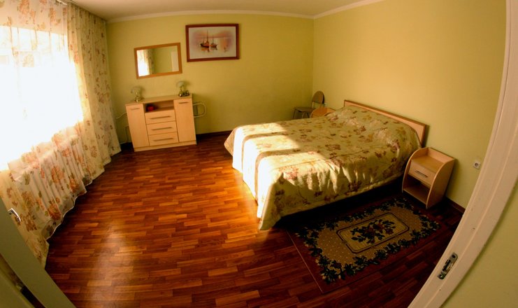 В номере: зеркало, кровать двуспальная, кровать односпальная, набор мягкой мебели, прикроватные тумбочки, стол, стулья, шкаф, набор посуды, телевизор, холодильник, чайный набор посуды, электрочайник