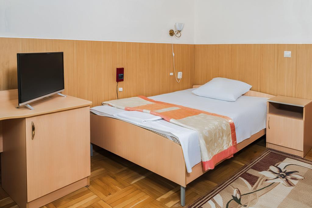 В номере: полутораспальная кровать, тумба, стол, журнальный столик, мягкие стулья, телевизор, холодильник, чайник, кондиционер, набор посуды