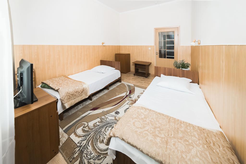 В номере: две односпальные кровати, тумбы, журнальный столик, стулья, телевизор, холодильник, чайник
