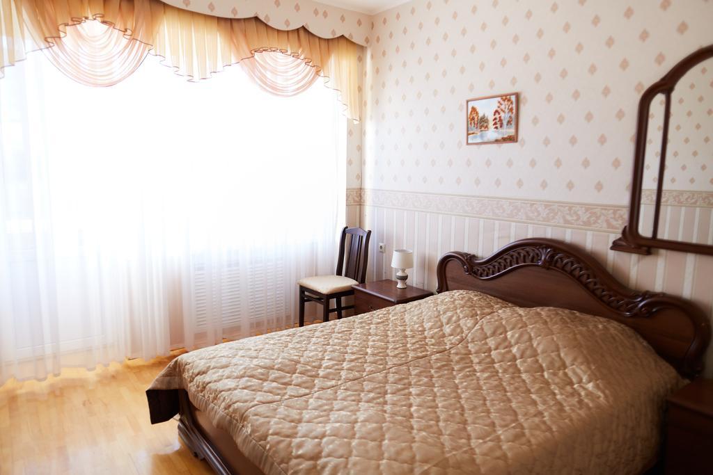 В номере: две комнаты: спальня и гостиная, одна двуспальная либо две односпальные кровати, тумбы, стол, журнальный столик, мягкие стулья, мягкая мебель, телевизор, холодильник, чайник, кондиционер, набор посуды
