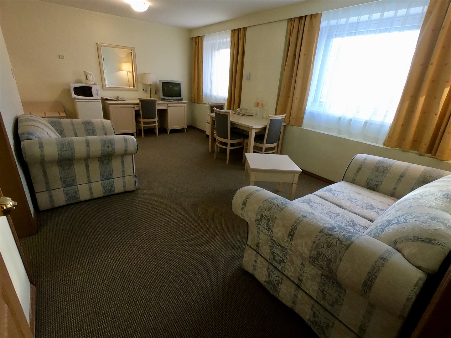 В номере: вешалка, зеркало, кровати односпальные /одна двуспальная кровать, набор мягкой мебели, стол, стулья, шкаф, кондиционер, микроволновая печь, сейф, телевизор, телефон, чайный набор посуды, электрочайник
