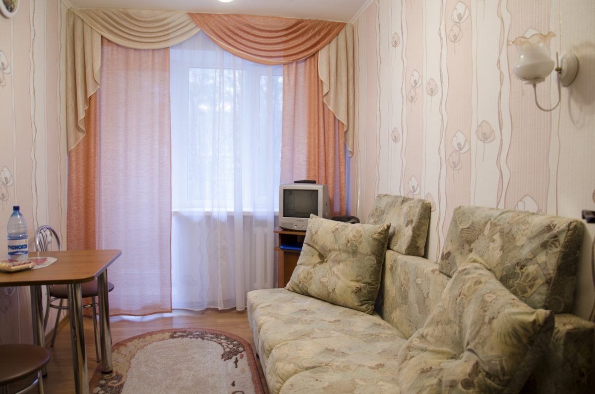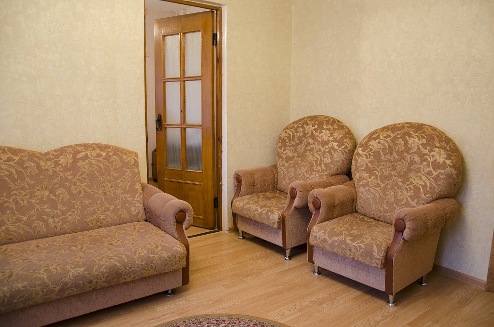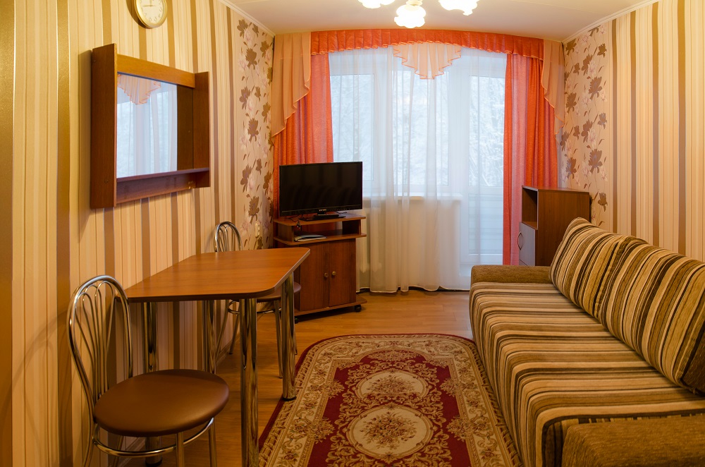 В номере: диван, тумба под телевизор, шкаф для одежды, стол, стулья, холодильник, утюг, гладильная доска, электрочайник, посуда