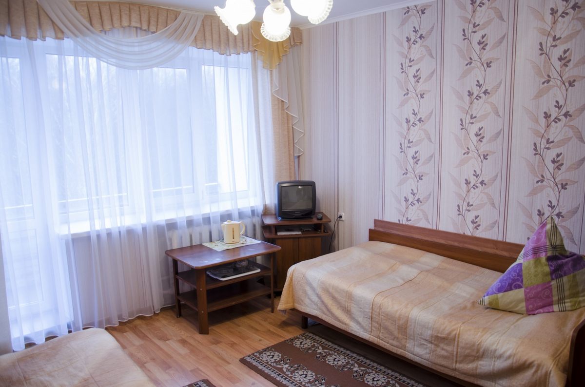 В номере: две односпальные кровати, прикроватные тумбы, телевизор, тумба под телевизор, шкаф для одежды, стол, стулья, холодильник, электрочайник, посуда