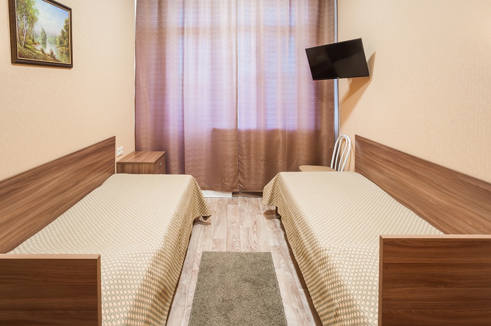 Оснащение комнаты: двуспальная кровать или две односпальных кровати, две прикроватные тумбочки, стол, стул, телевизор, холодильник, чайник, набор посуды, WI-FI.