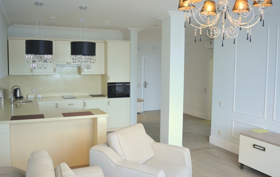 В номере: гардеробная: с системой хранения, диван раскладной, кровать двуспальная, кухонная мебель, прикроватные тумбочки, пуфик, стол, стулья, гладильная