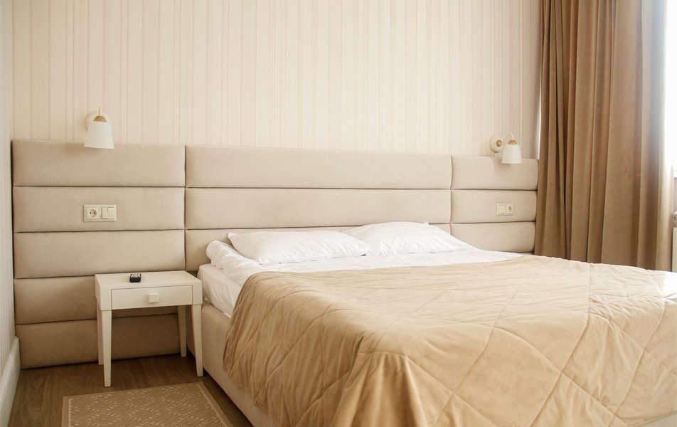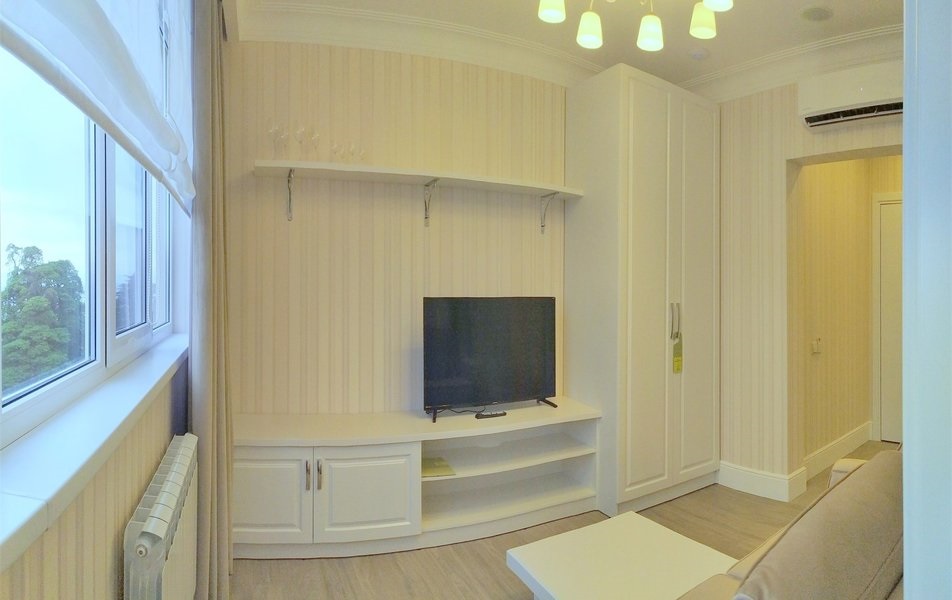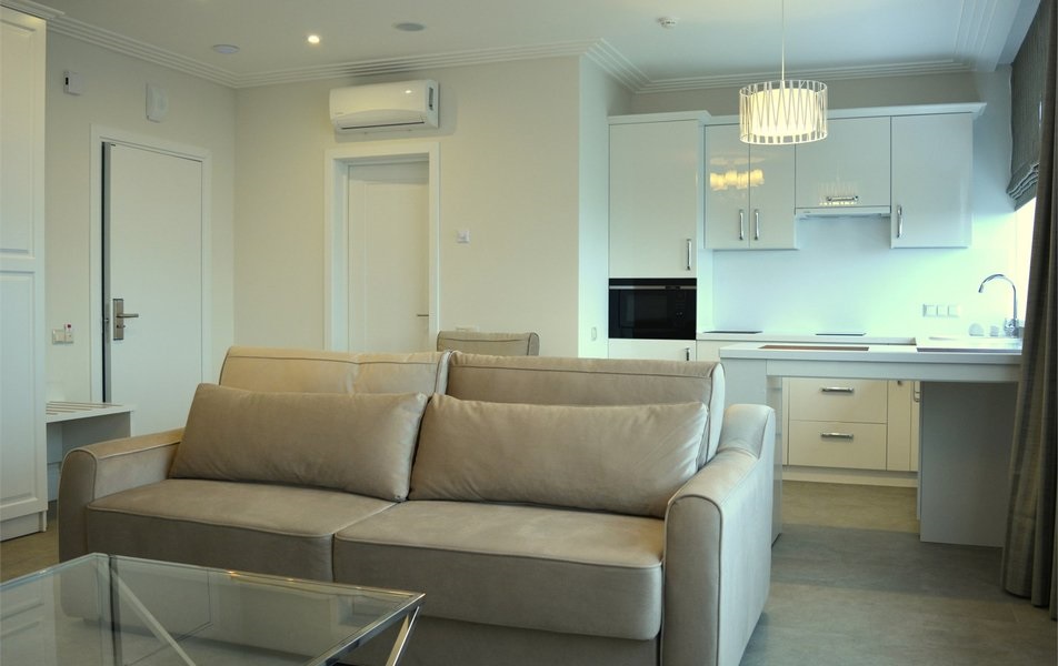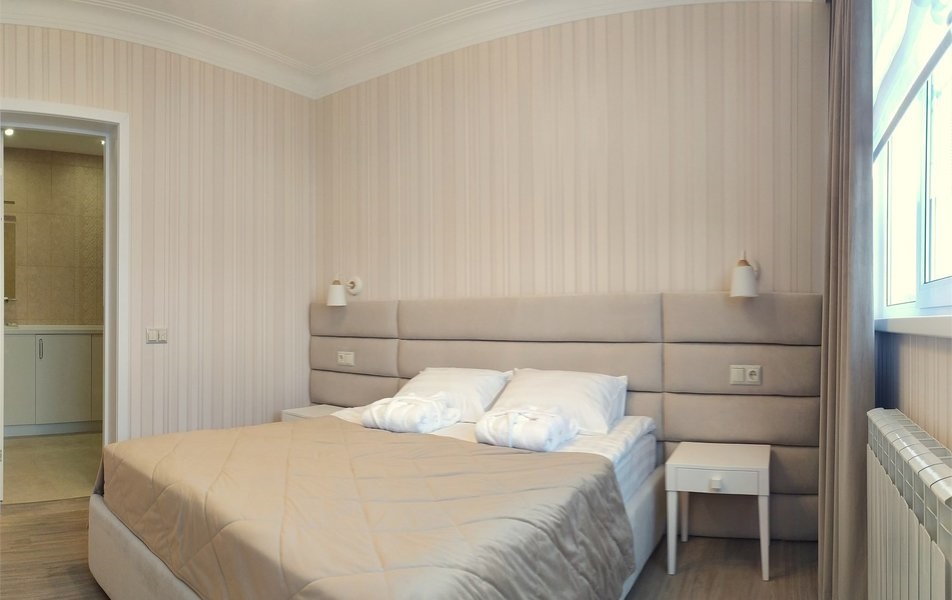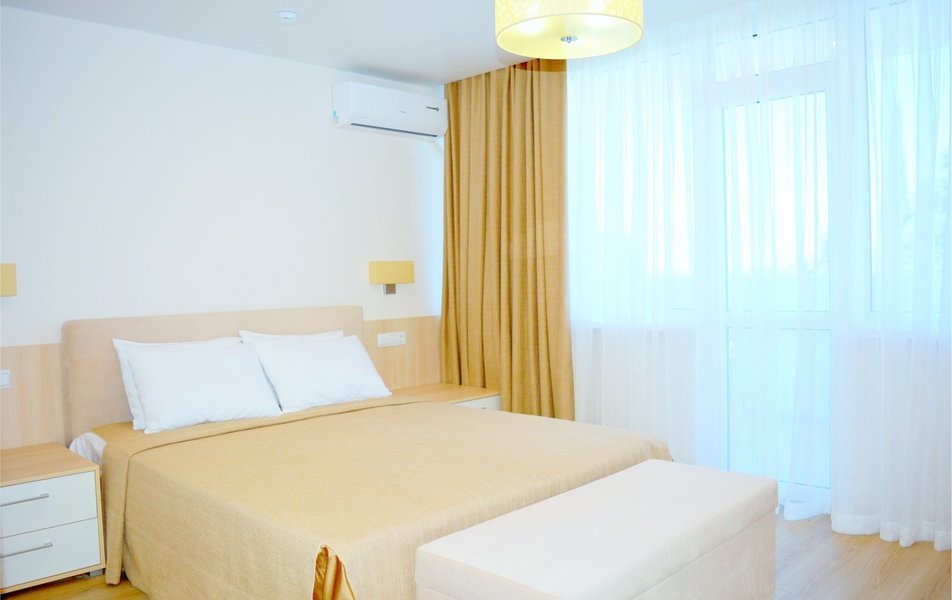 В номере: диван, кровать двуспальная, прикроватные тумбочки, шкаф встроенный, гладильная доска, кондиционер, мини-холодильник, набор посуды, стиральная машина, телевизор, телефон, утюг, электрочайник