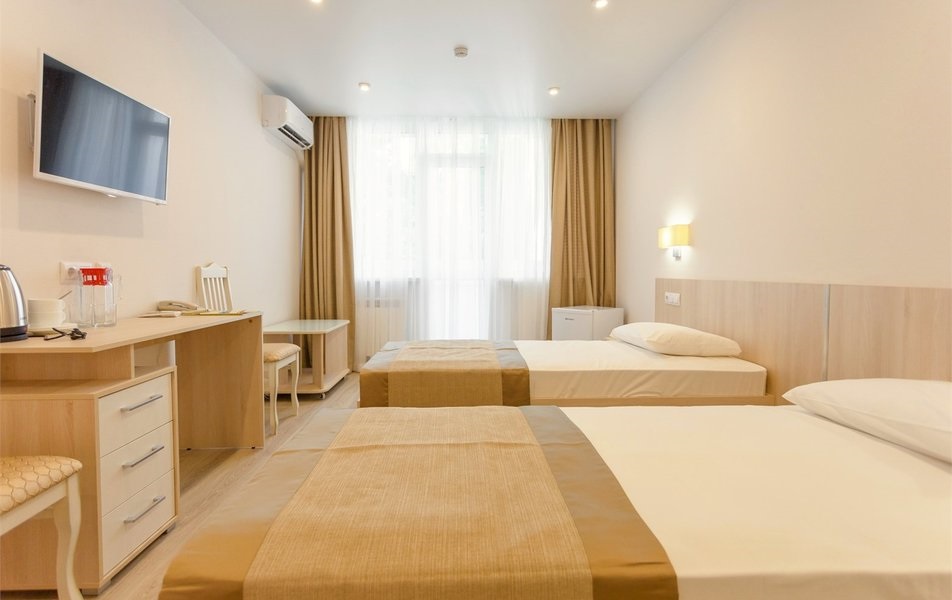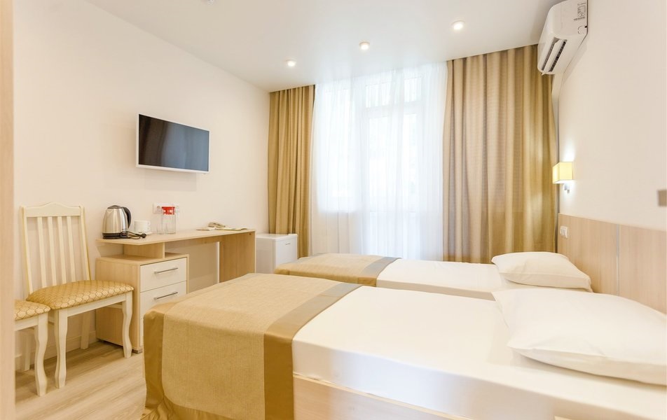 В номере: кровати односпальные, прикроватные тумбочки, стол, стулья, шкаф, кондиционер, мини-холодильник, телевизор, телефон, чайный набор посуды, электрочайник