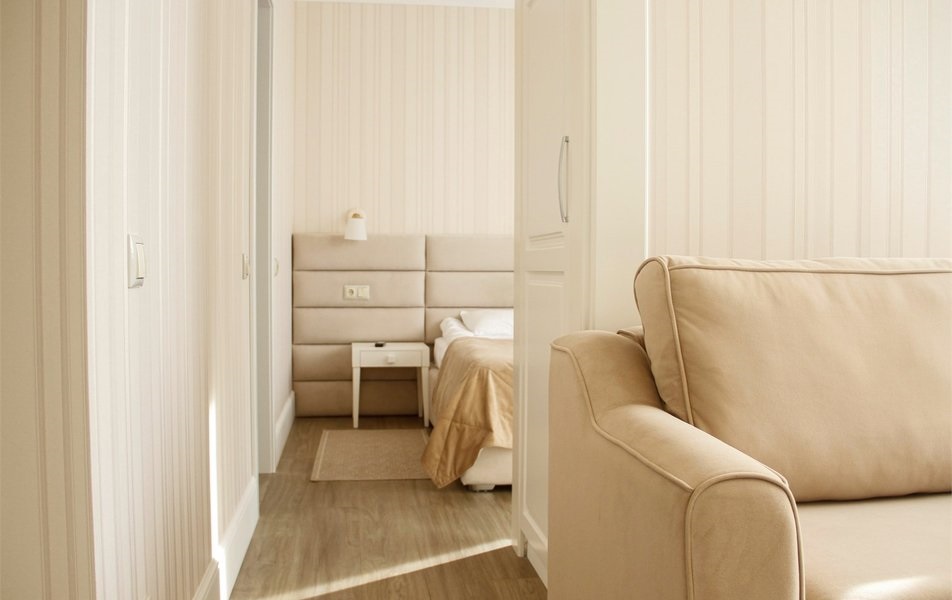 В номере: диван, кровати односпальные /одна двуспальная кровать, прикроватные тумбочки, стулья, шкаф, кондиционер, мини-холодильник, телевизор, телефон, электрочайник