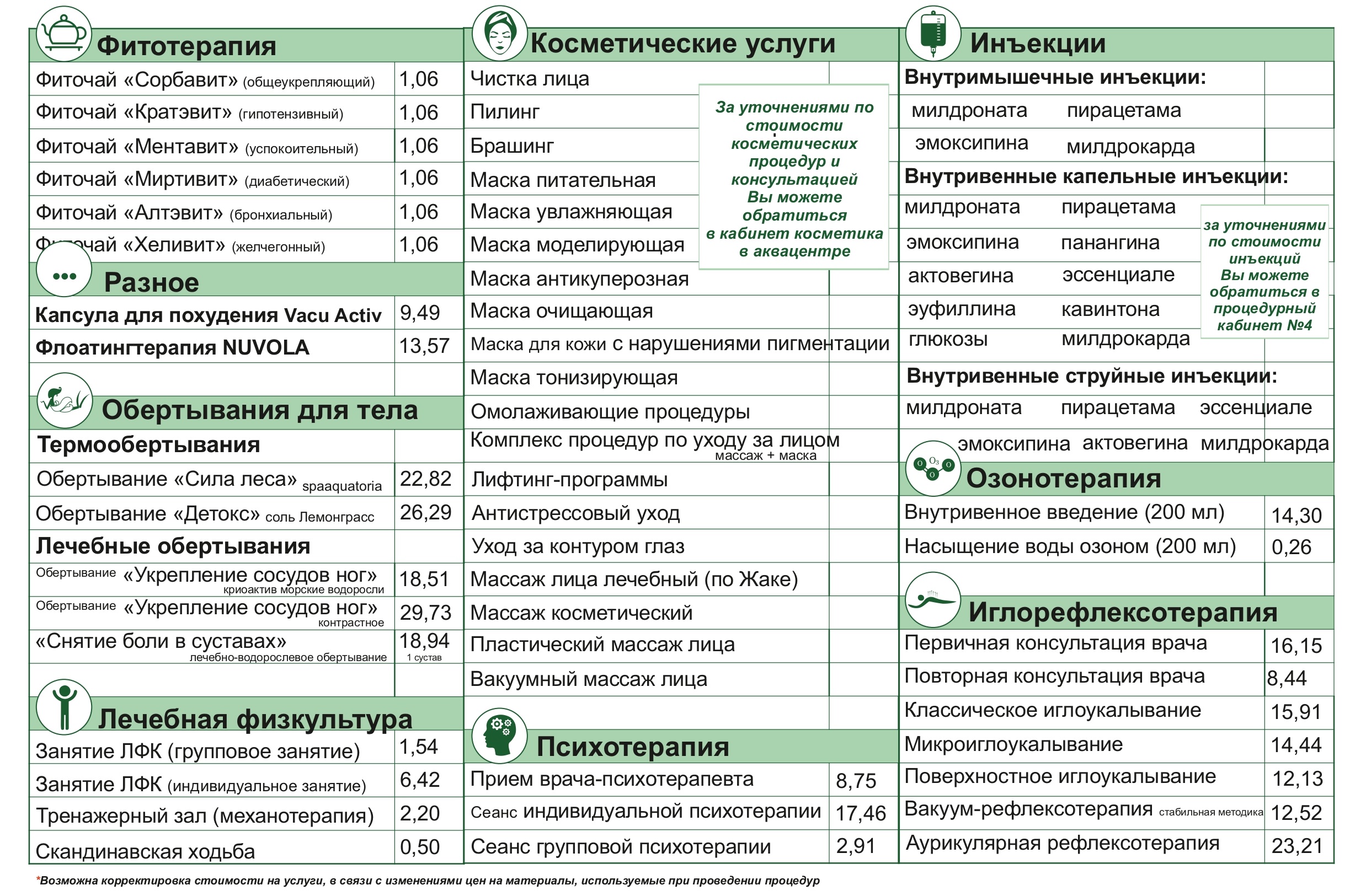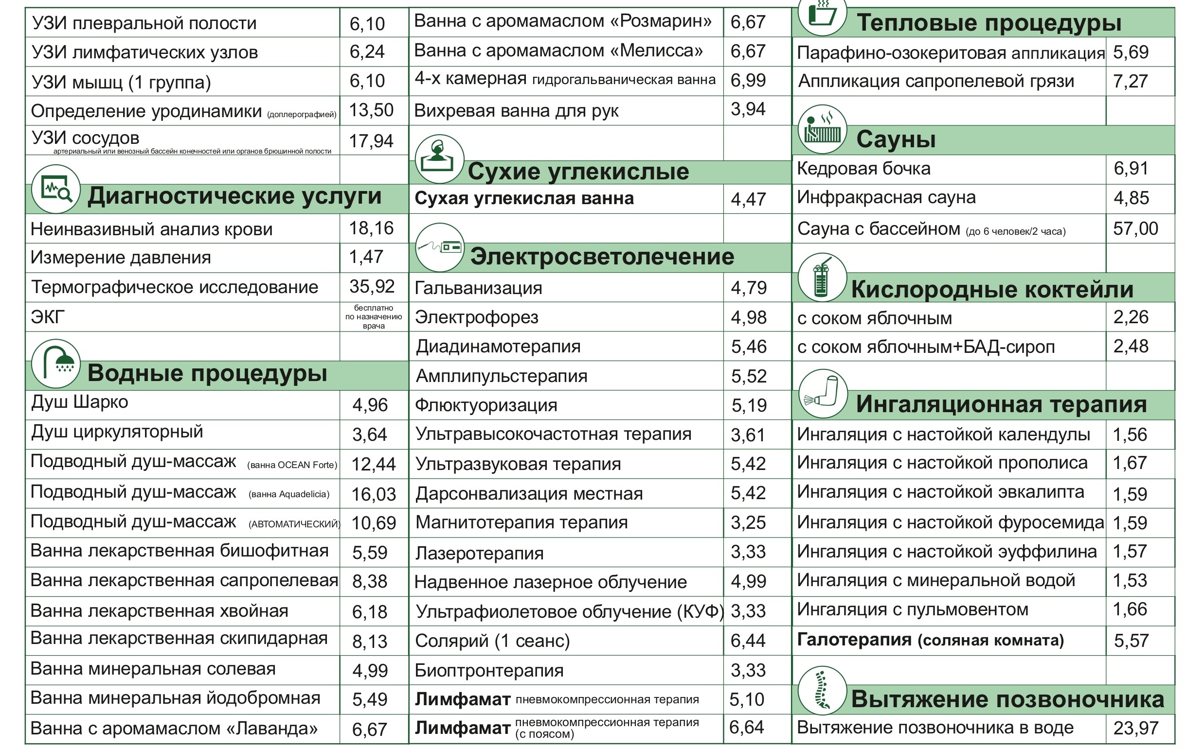 Прейскурант цен на процедуры, оказываемые в санатории «Надзея»