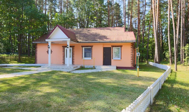 В коттедже: две комнаты: спальня и гостиная с кухней, двуспальная кровать, прикроватные тумбочки, стол, стулья, шкаф-купе, шкаф для посуды, набор мягкой мебели, мини-кухня, набор посуды, телевизор ЖК, холодильник, электрическая плита