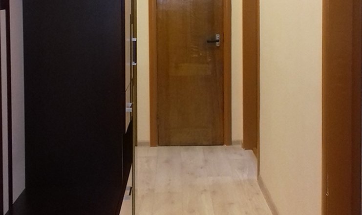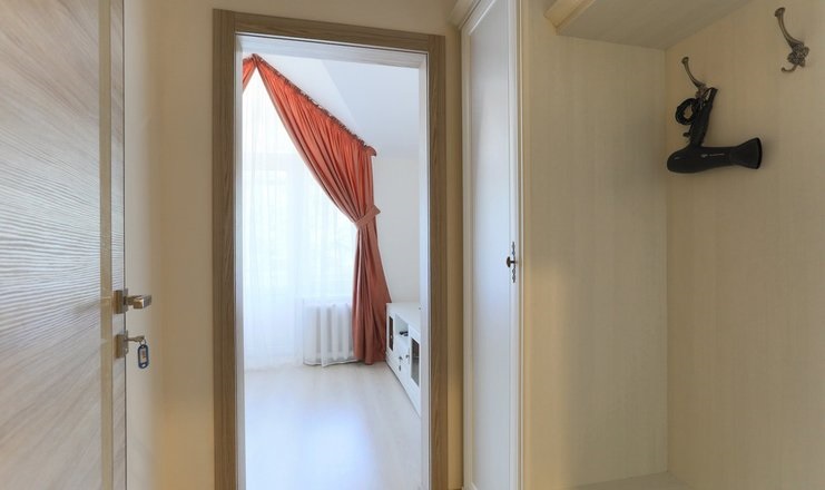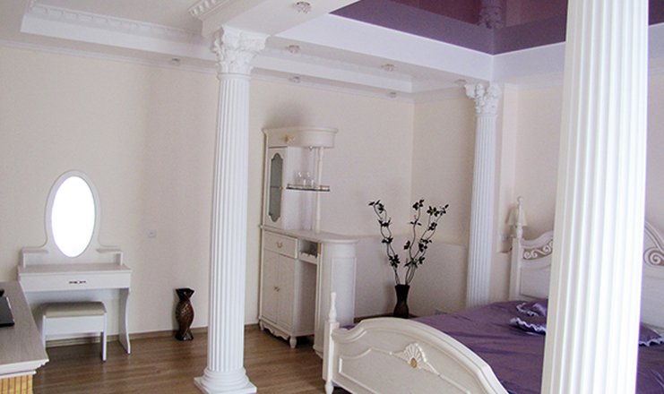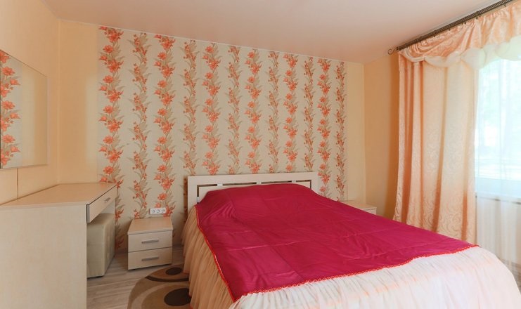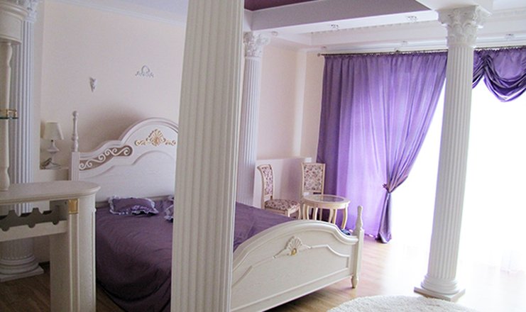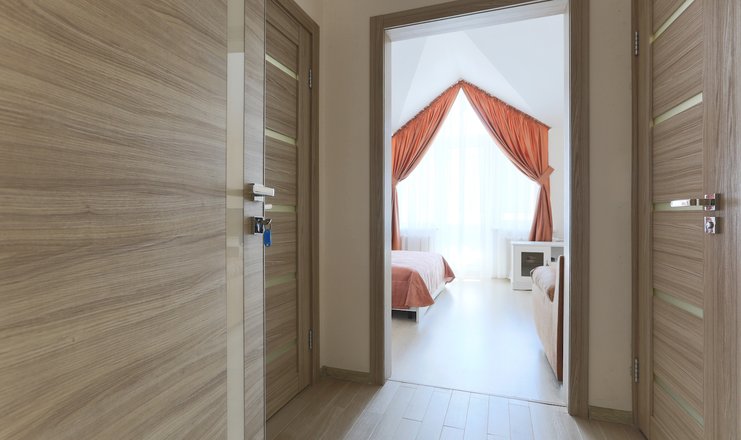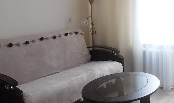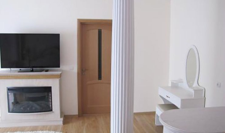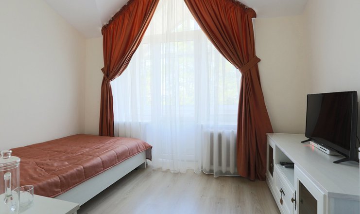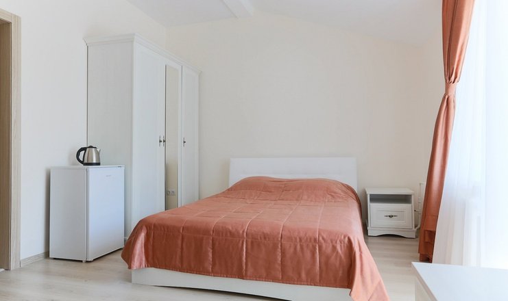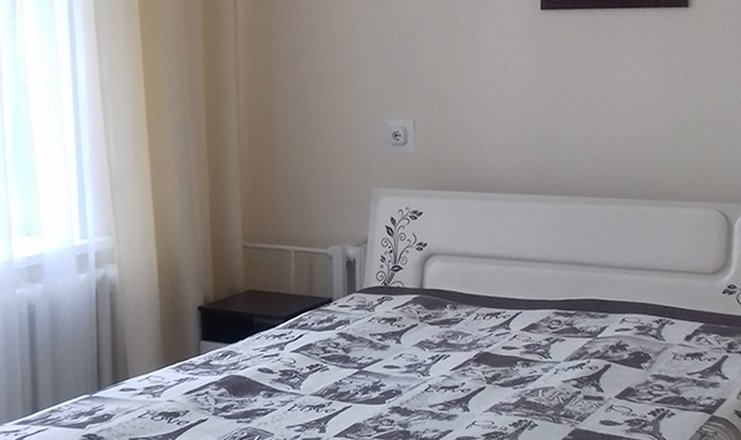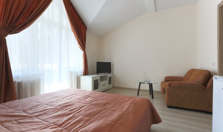 В номере: двуспальная кровать, прикроватные тумбочки, стол, стулья, шкаф-купе, диван раскладной, набор посуды, телевизор ЖК, холодильник, электрочайник