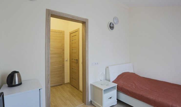 В номере: односпальная кровать, прикроватная тумбочка, стол, стул, шкаф-купе, набор посуды, телевизор, холодильник, электрочайник