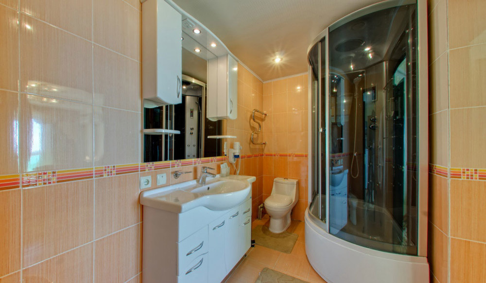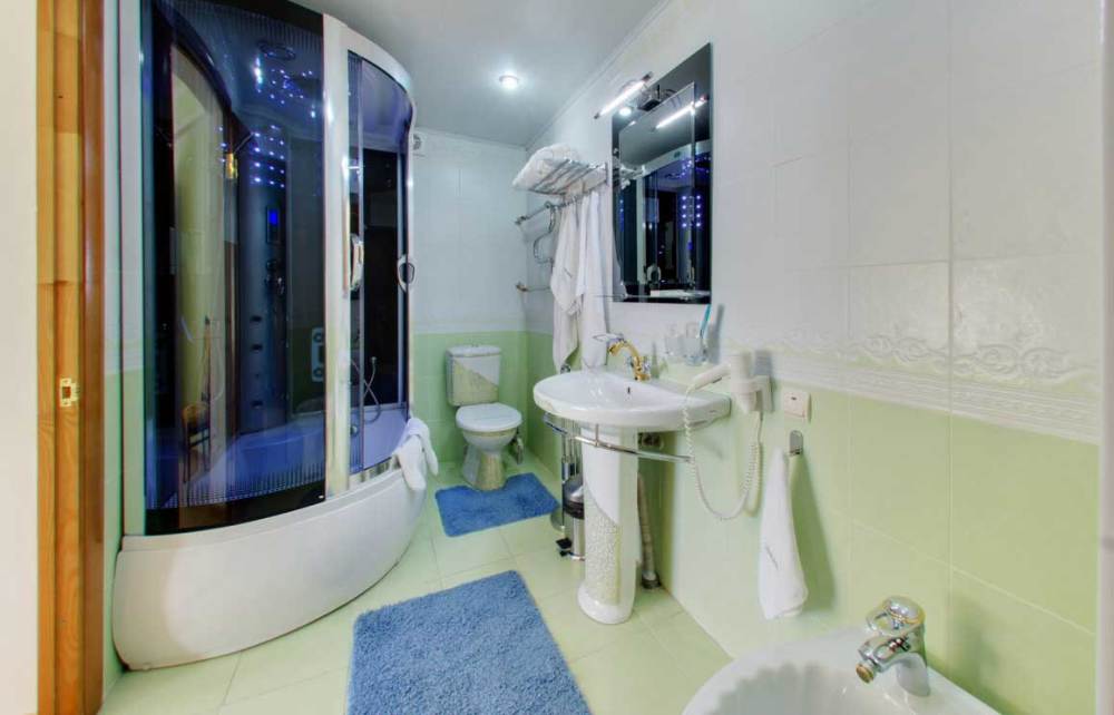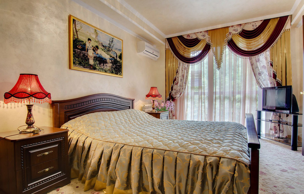 В номере: две комнаты: спальня и гостиная, двуспальная кровать, прикроватные тумбы, посудный шкаф, стол, стулья, комод, пуф, мягкая мебель, шкаф/гардероб, мини-холодильник, телевизор, телефон, кондиционер