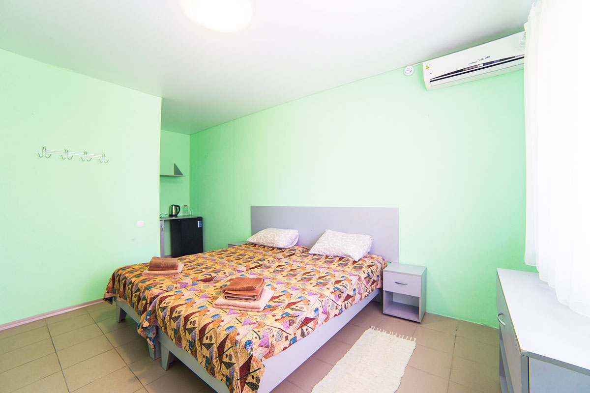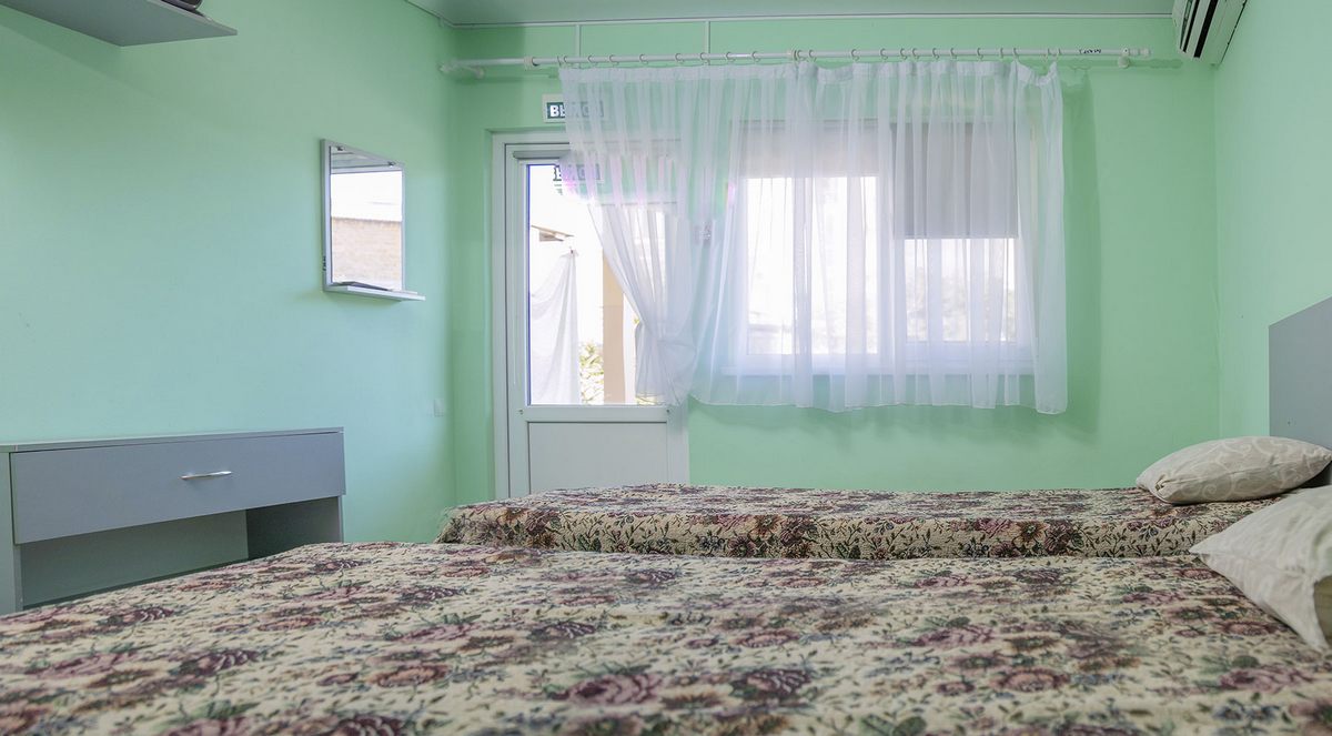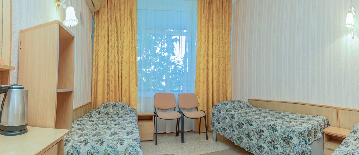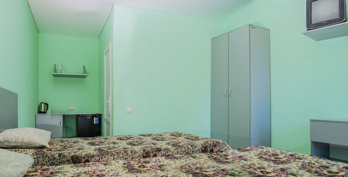 В номере: две односпальные кровати, прикроватные тумбы, стол, шкаф, телевизор, холодильник, кондиционер, чайник