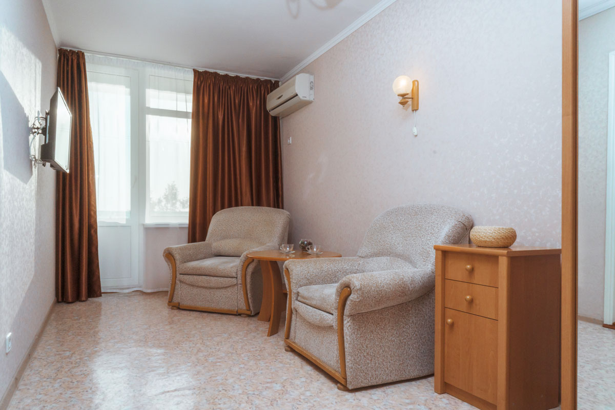 В номере: две комнаты: спальня и гостиная, 2-х спальная кровать, прикроватные тумбы, 2 кресла, журнальный столик, шкаф, телевизор, холодильник, слит-система, утюг и гладильная доска, чайник