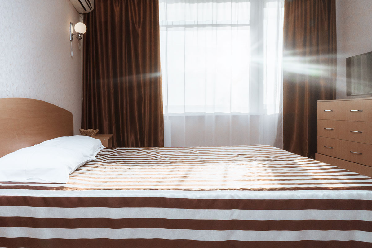 В номере: кровать шириной 120 см, прикроватная тумба, стул, стол, шкаф, телевизор, холодильник, кондиционер