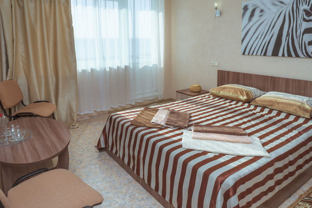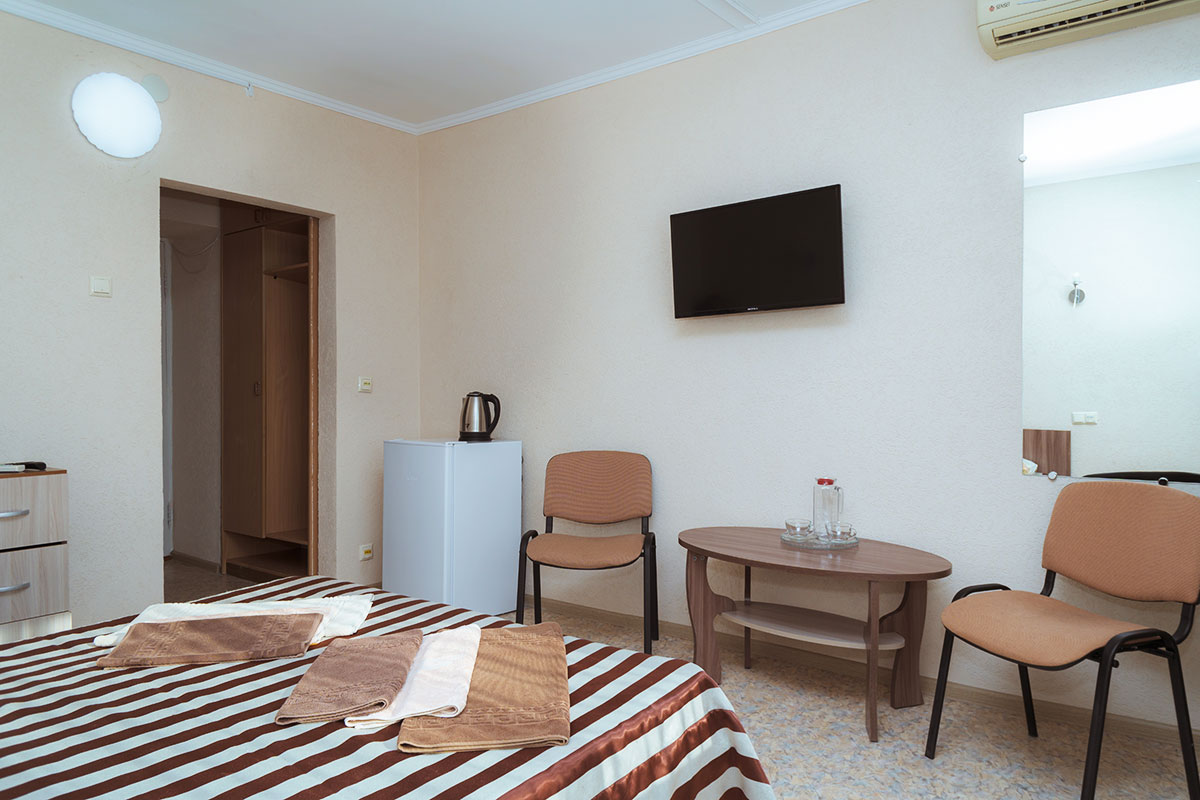 В номере: двуспальные кровать, прикроватные тумбы, стол, стулья, шкаф, телевизор, холодильник, кондиционер, чайник