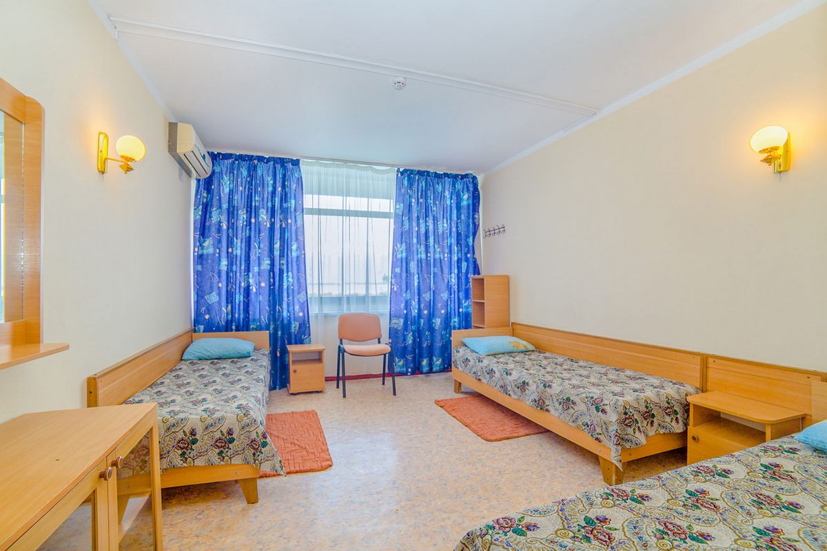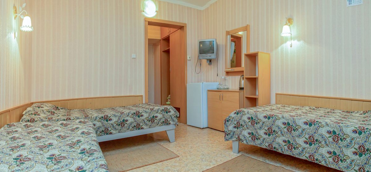 В номере: три односпальные кровати, прикроватные тумбы, стол, стулья, шкаф, телевизор, холодильник, кондиционер, чайник