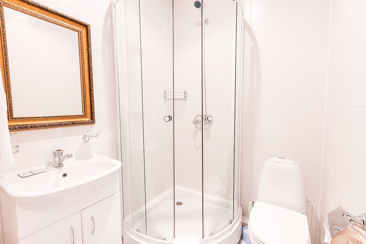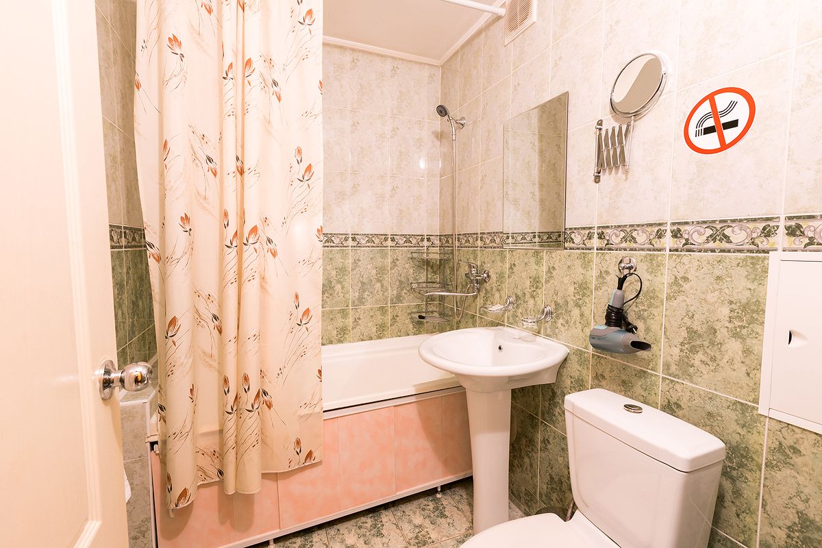 Санузел: душ или ванна, раковина, унитаз, фен, гигиенические принадлежности, полотенца, белье