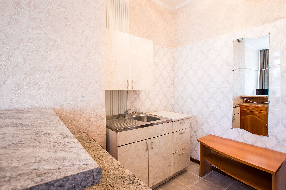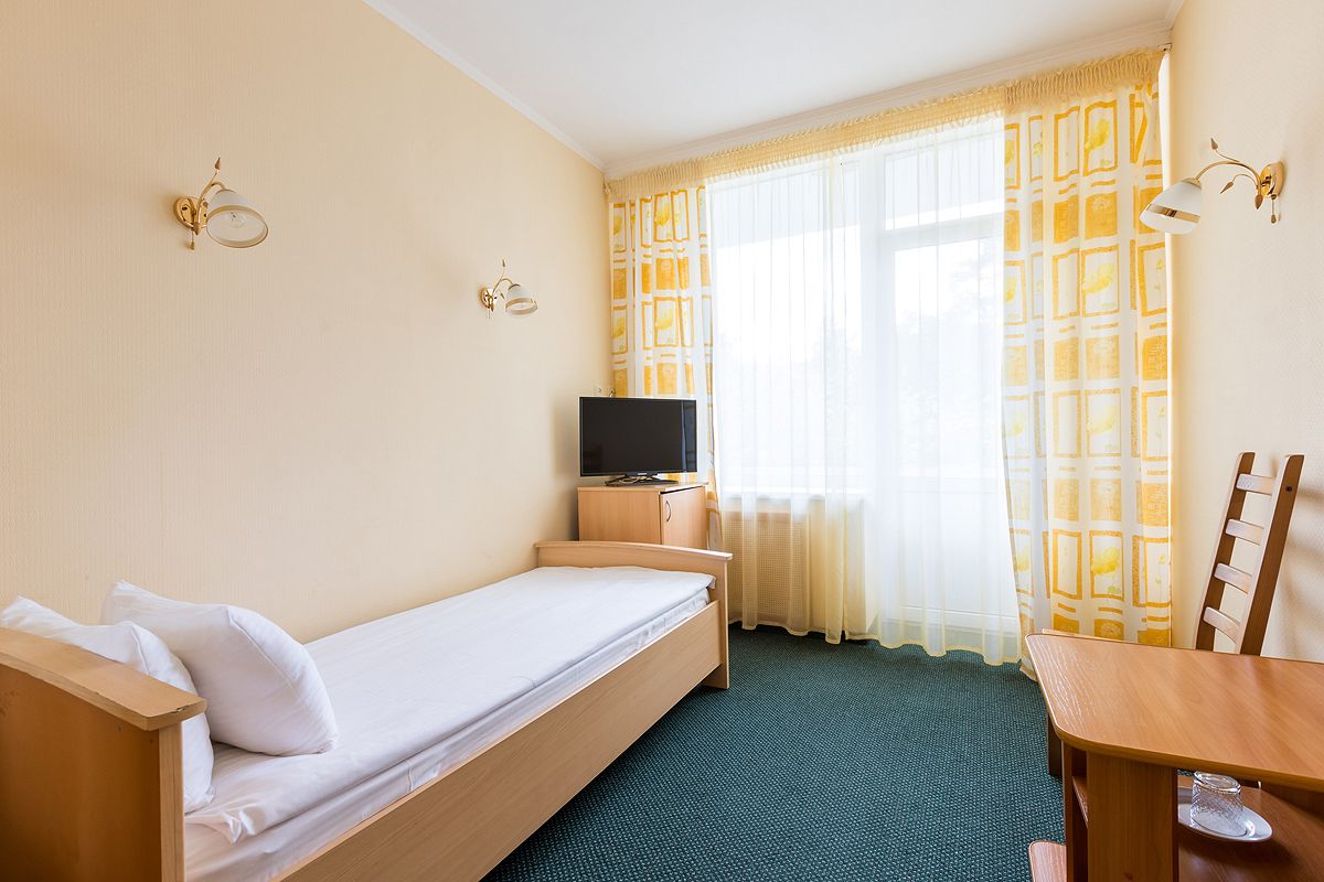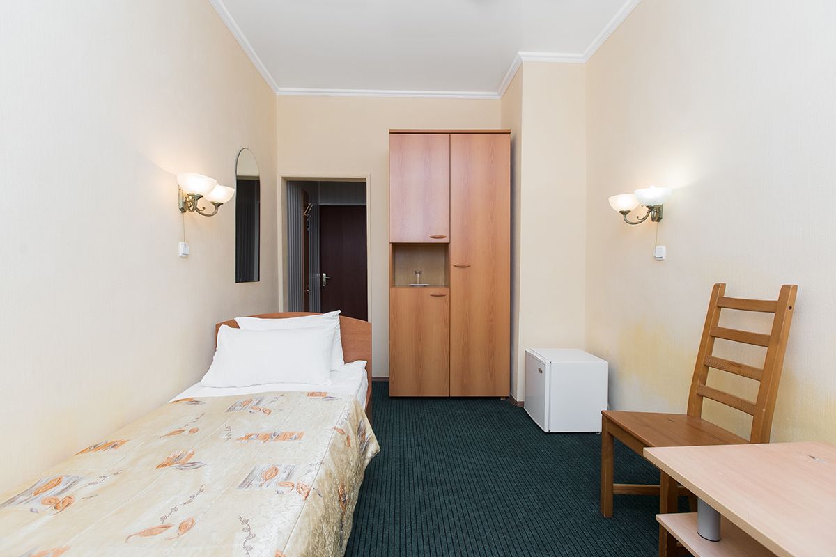 В номере: односпальная кровать, прикроватная тумба, стол, стул, шкаф, телевизор, холодильник, набор посуды, балкон (в некоторых номерах)