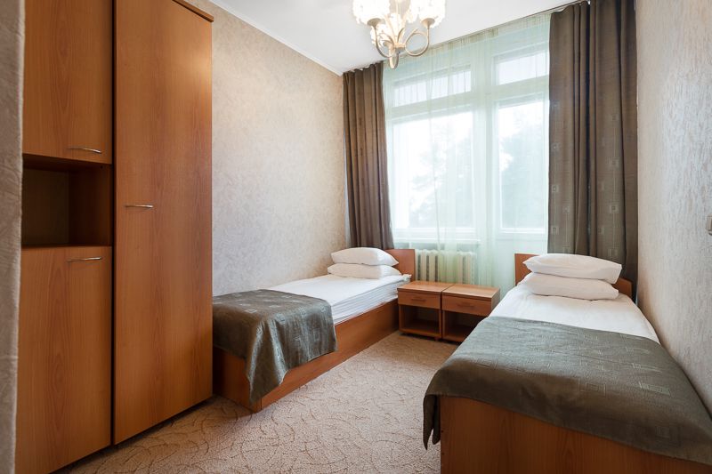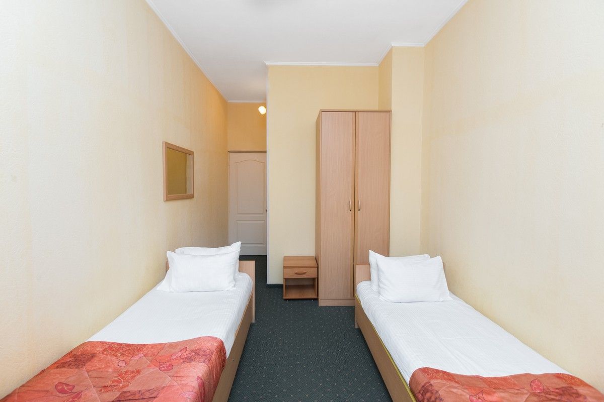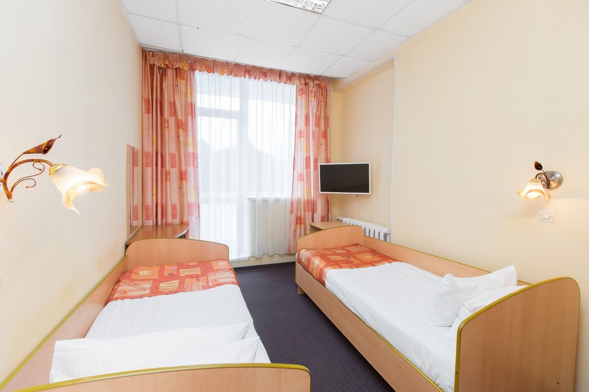 В номере: две односпальные кровать, прикроватные тумбы, стол, стулья, шкаф, телевизор, холодильник, набор посуды, балкон (в некоторых номерах)