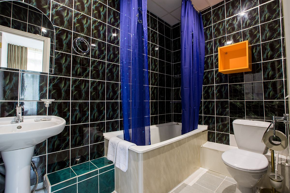 Санузел: ванна, раковина, унитаз, фен, гигиенические принадлежности, полотенца, белье