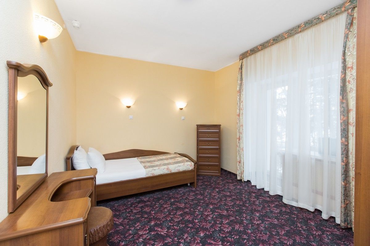 В номере: две комнаты: спальня и гостиная, две односпальные кровать, прикроватные тумбы, стол, стулья, шкаф, мягкая мебель, журнальный столик, кухонный уголок, телевизор, холодильник, набор посуды, балкон (в некоторых номерах)