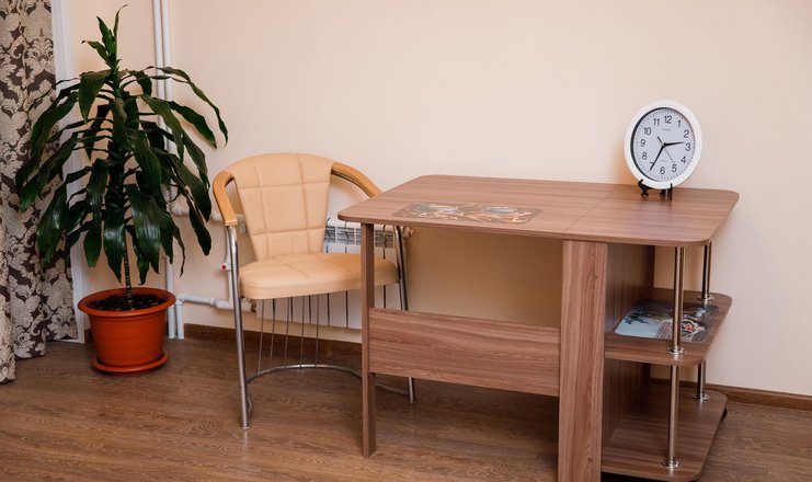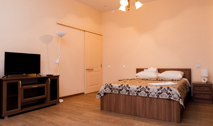 В номере: вешалка, диван раскладной, зеркало, комод, кровать двуспальная, прикроватные тумбочки, стол, столик журнальный, стул, шкаф-купе, шкаф для посуды, мини-холодильник, набор посуды, телевизор ЖК, чайный набор посуды, электрочайник