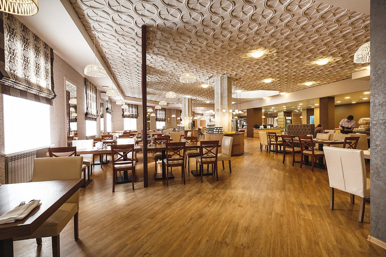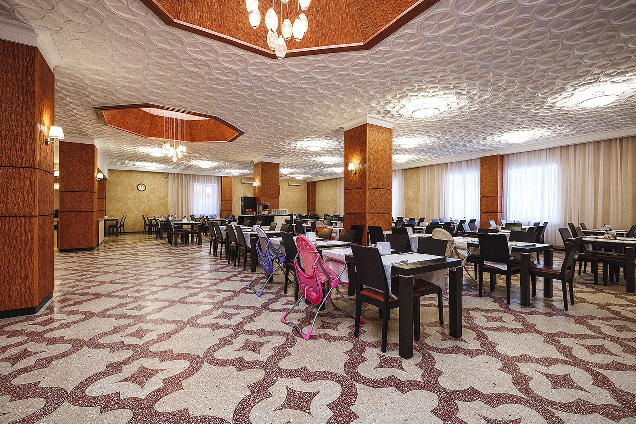 состоит из двух светлых залов на 400 посадочных мест и принимает гостей, проживающих в номерах категории "Стандарт" и "Студия". Питание трёхразовое и организовано по системе "Шведский стол". Для детей до 12 лет и взрослых с заболеванием сахарный диабет добавлены второй завтрак и полдник. Ежедневно на столах отдыхающих более 60 видов блюд, меню обновляется каждые 10 дней. Постояльцы, которые придерживаются диетического питания могут выбрать одну из 14 диет, которые действуют в санатории. Питание организовано в три смены: 1 смена 2 смена 3 смена