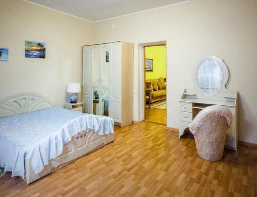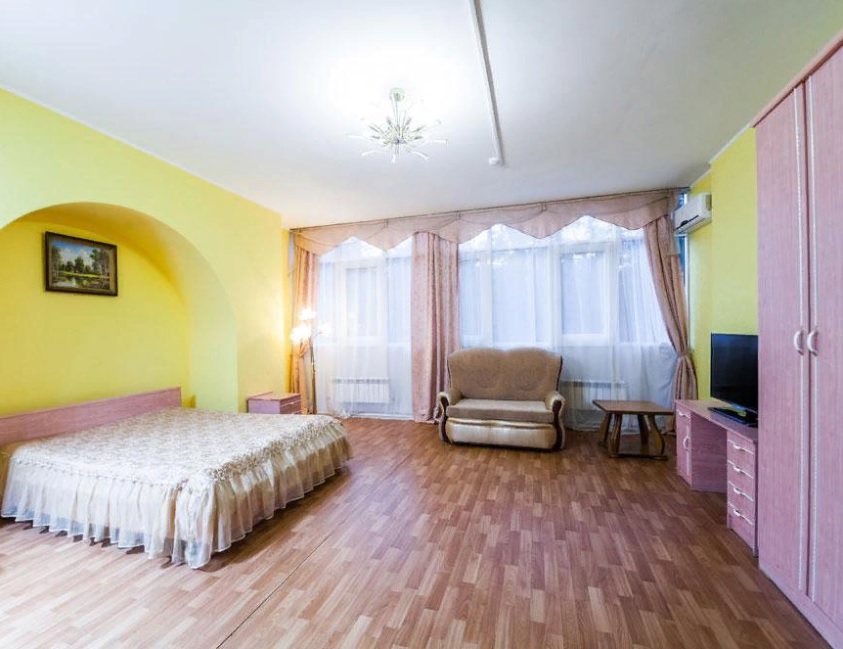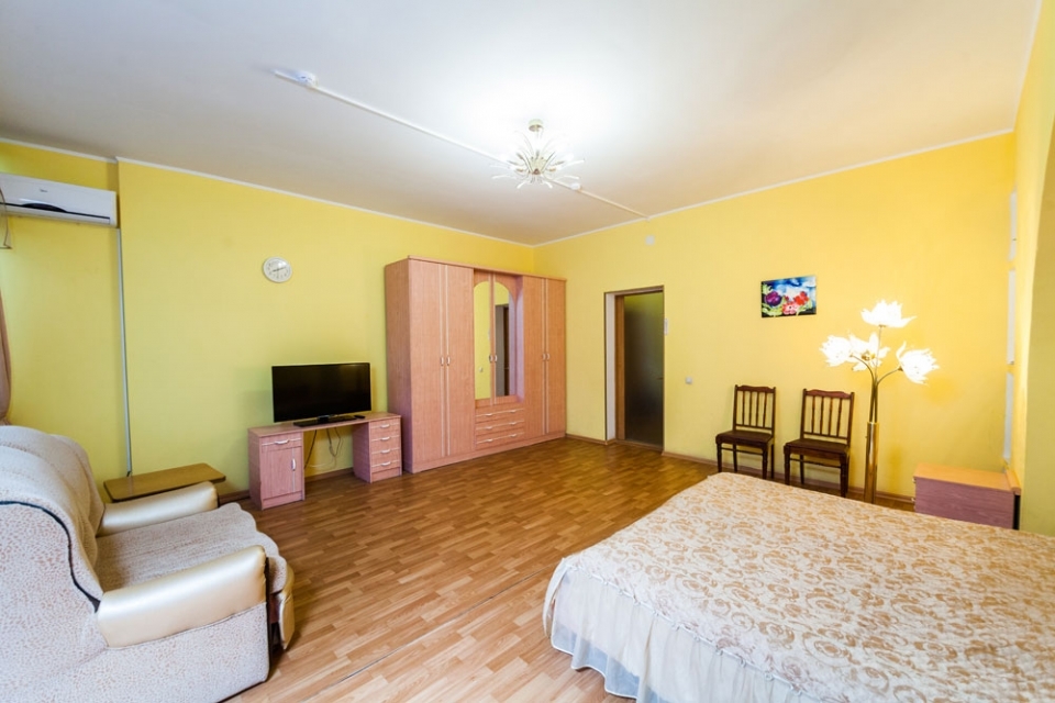 В номере: Двуспальная кровать, кофейный столик, платяной шкаф, телевизор, холодильник, Wi-Fi, фен, белые махровые халат и тапочки.